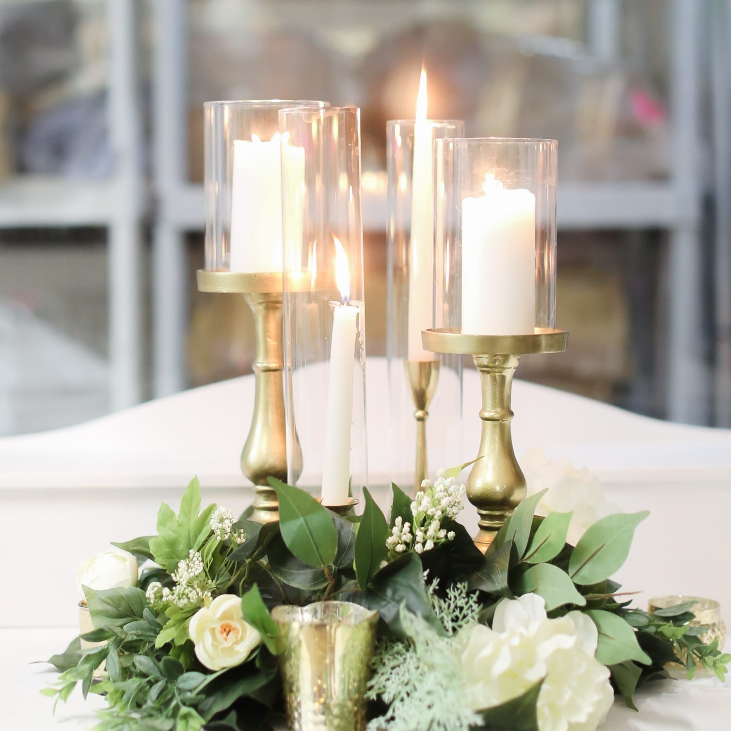 price per set of 2 x Lan Gold Candlesticks Holder Taper with Real Candle & Clear Hurricane Cover, 2 x Loisa Gold Pillar Candle Holder with Real Pillar Candle & Clear Hurricane Cover, 2 x Varied Gold Double Votive, and Greenery with Florals or Gold Accents.