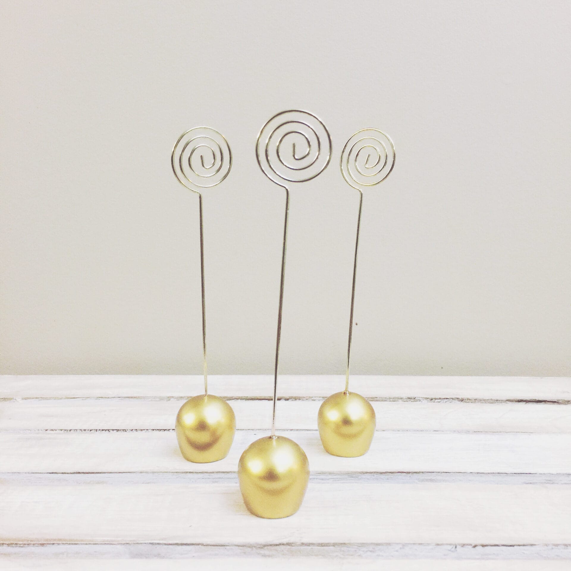 Our Jaclyn Gold Card Holder (weighted) features a minimalist design consisting of a semi-ball base and spiral top. Its simplicity allows it to work well with any kind of wedding or event, with or without complementary embellishments. It can easily be incorporated into your table centerpieces to hold your table numbers or be set on your other tables to indicate items.