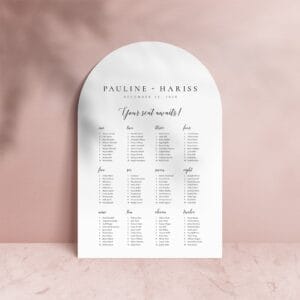 Using the colours black and white with a classic cursive font allows for an elegant way to start off your night. This beautiful seating chart is customizable and available in a variety of fonts.