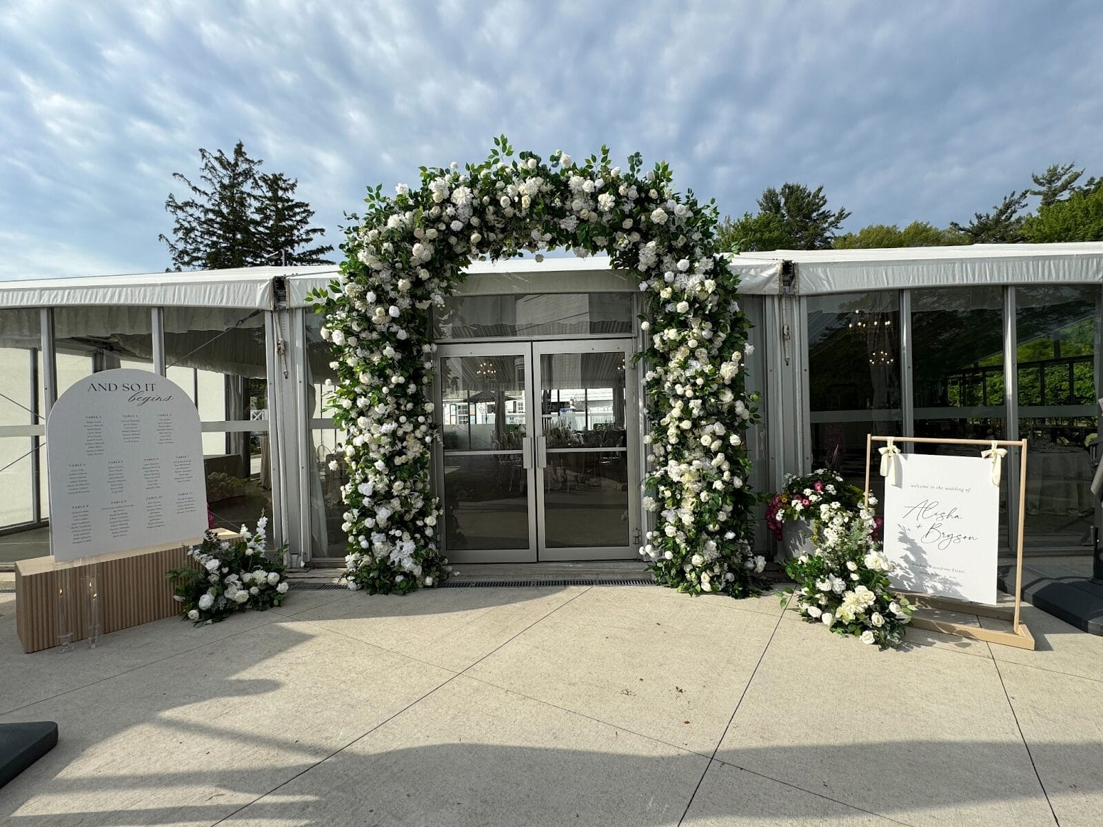 - A full floral arch at the entrance featuring white roses, ranunculus, and leafy greens