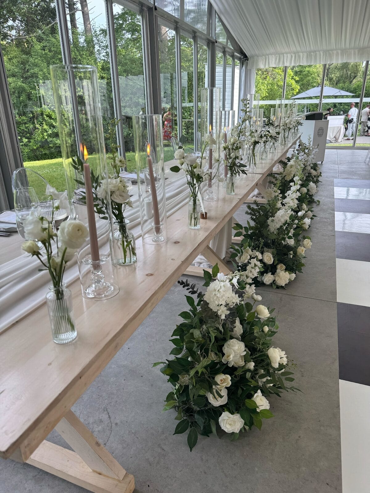 - Long head table with clean lines, tall glass candle sleeves, and florals placed low and wide across the base
